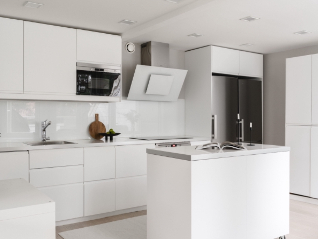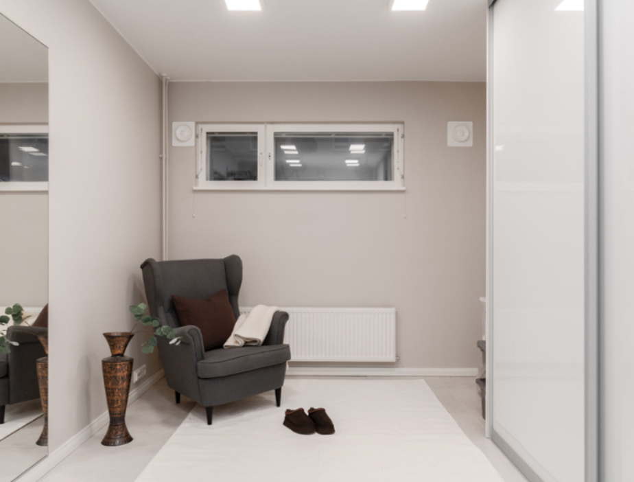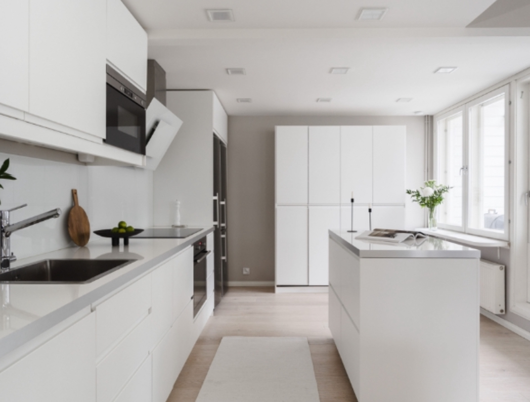 • Main Living Area: As you ascend via the elevator, you are welcomed by a bright and expansive living area. The open-plan design seamlessly connects the kitchen, dining area, and living room into one unified space. This area boasts high ceilings, allowing natural light to flood the home and enhance the sense of openness and airiness. The design is modern, while still maintaining a touch of traditional Finnish elegance.