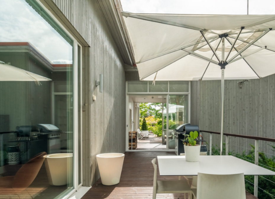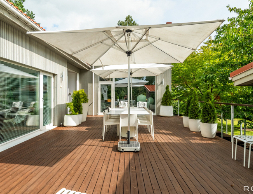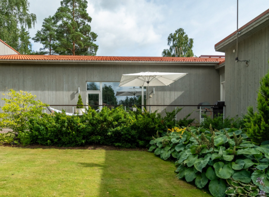 The property sits on a green, landscaped yard with trees and shrubs. The lawn area provides open space that can be used for outdoor activities, gardening, or relaxation. Terraces around the house offer additional outdoor living areas during warmer months, suitable for dining, resting, or hosting small gatherings.
