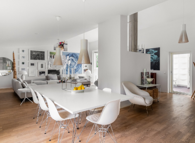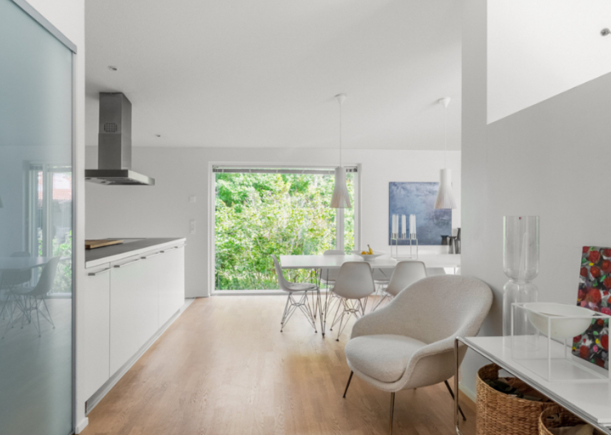The living room, dining room, and kitchen are structurally connected and form the central core of the house. These spaces are open to one another, creating a continuous flow between cooking, dining, and everyday living. Large windows are used throughout this area, allowing natural light to enter and giving a clear connection to the surrounding yard and outdoor spaces.