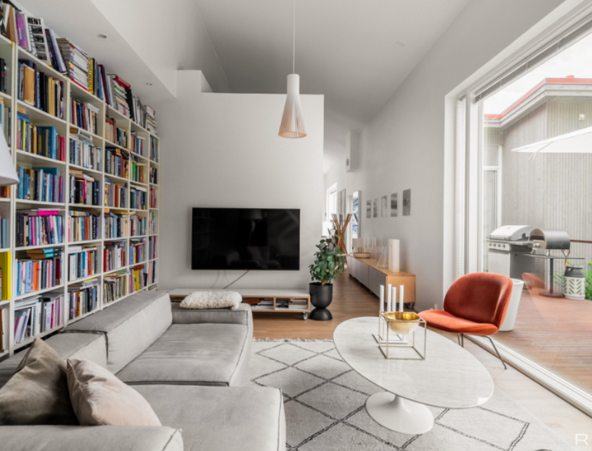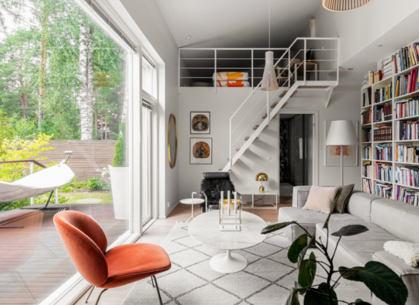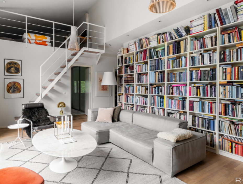 The library space can function flexibly, depending on needs. It can be used as a reading room, work area, or secondary living space.