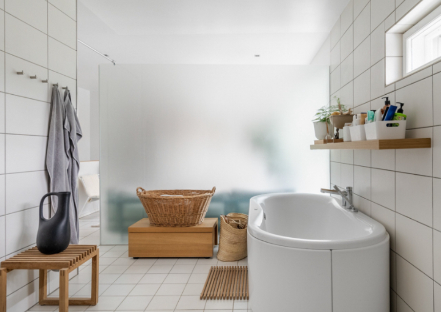 The sauna building is designed as a peaceful, self-contained area for bathing and relaxation. Because it is slightly separated from the main house, it offers privacy and minimizes disturbance to the rest of the household during use.